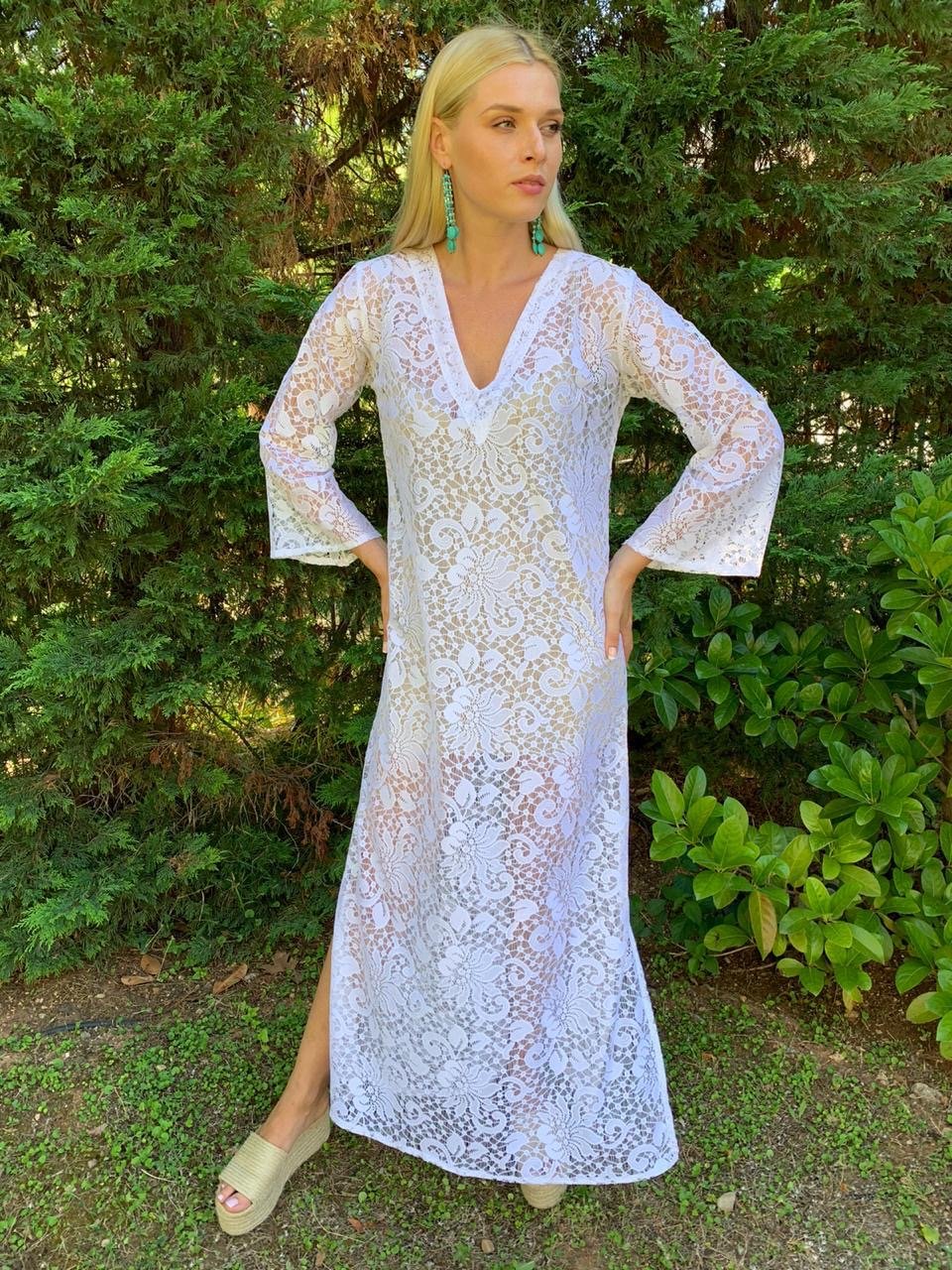 Καφτάνι από δαντέλα λευκή με άνοιγμα στο πλάι δεξιά και αριστερά και μανίκια καμπάνα.