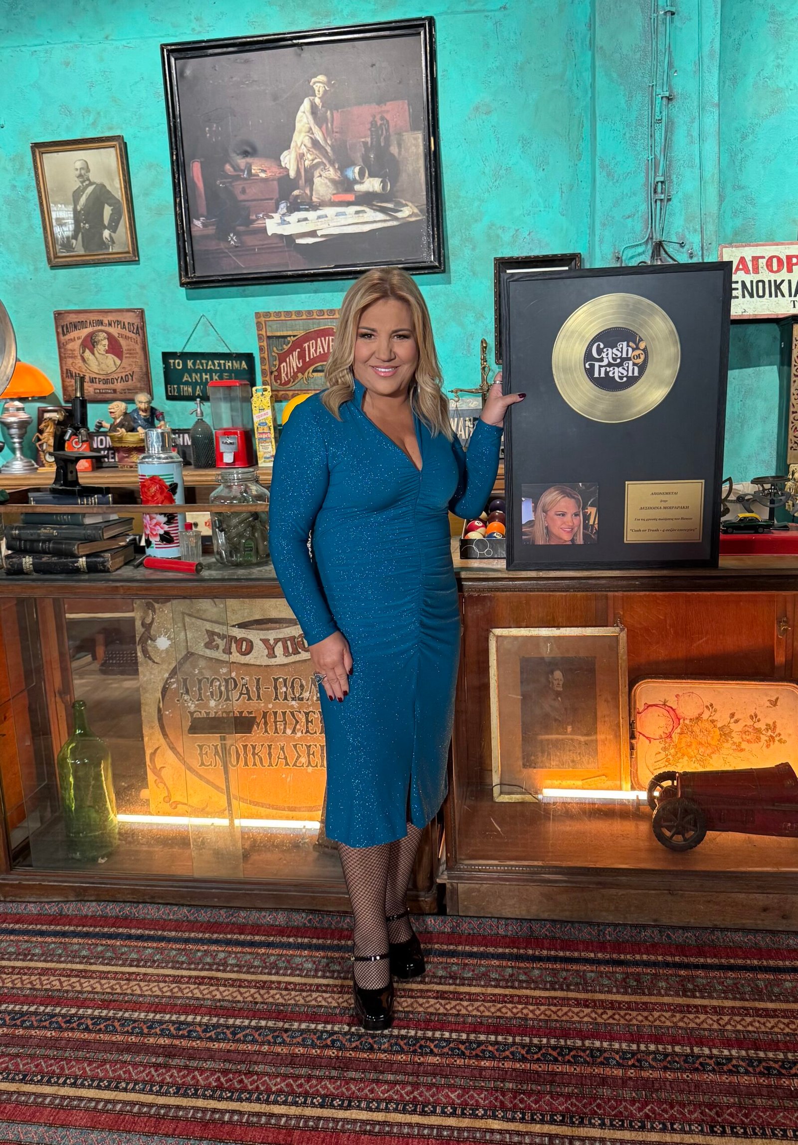 Το φόρεμα έχει μήκος μέχρι το γόνατο και μακριά στενά μανίκια.