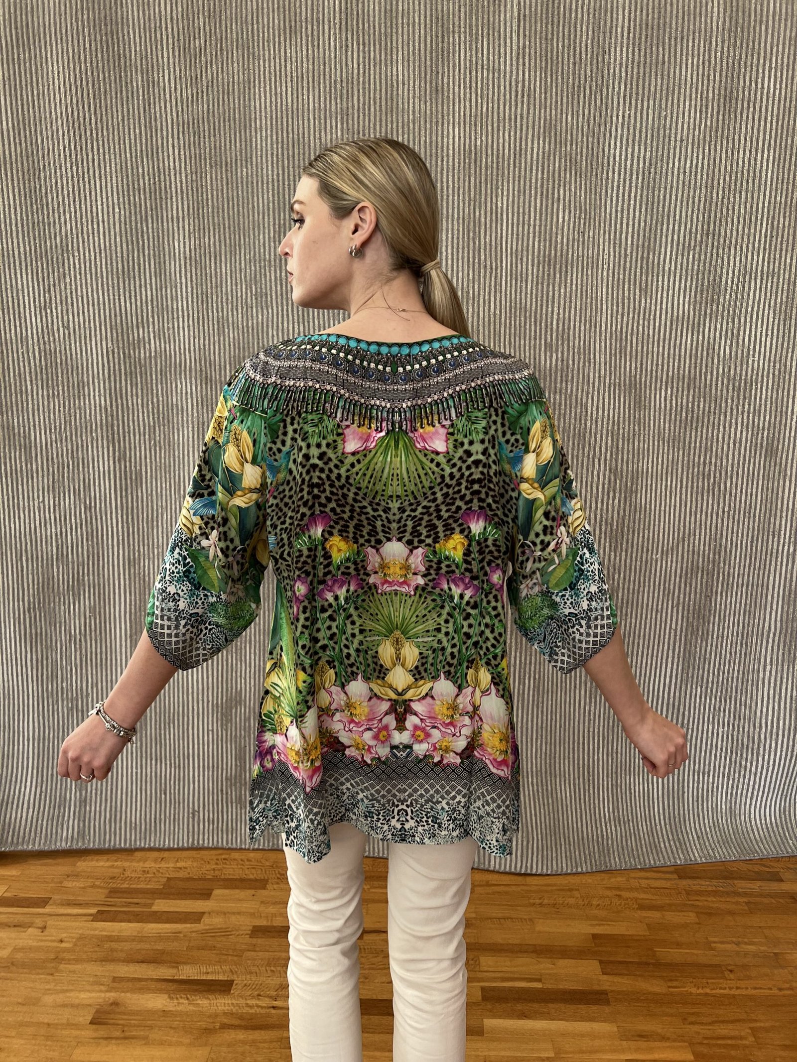 Μπλούζα από μετάξι (100% pure silk) με κοντά μανίκια. Η λαιμόκοψη είναι στολισμένη με πράσινες, τιρκουάζ & λευκές πέτρες Swarovski.
