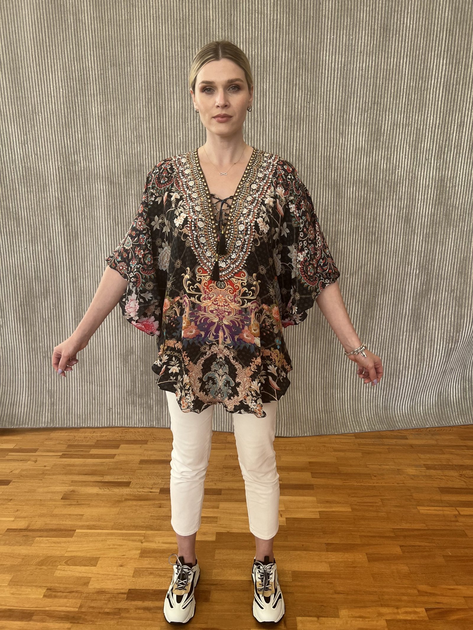 Μπλούζα από μετάξι (100% pure silk) με κοντά μανίκια και έχει κόψιμο νυχτερίδας. Το ντεκολτέ της είναι σε σχήμα V διακοσμημένο με λευκές πέτρες Swarovski και καταλήγει σε ένα δετό κορδόνι με μεταξωτές καφέ φούντες.