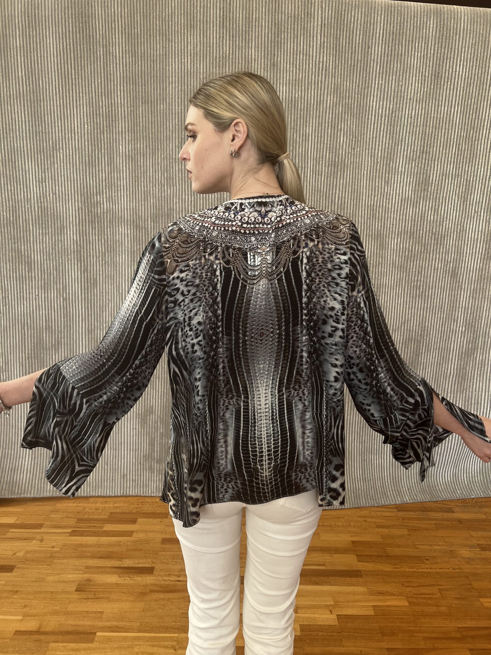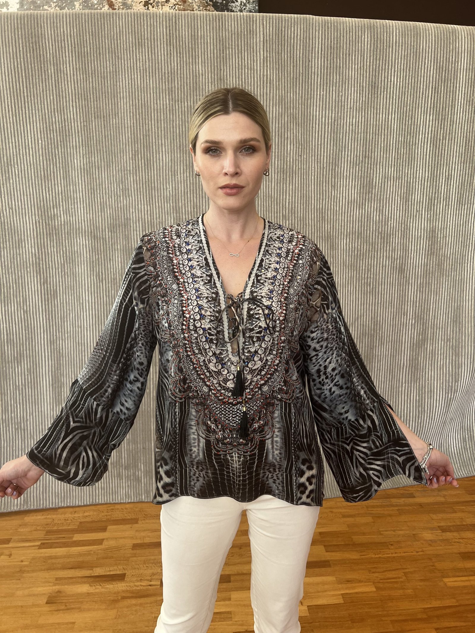 Μπλούζα από μετάξι (100% pure silk) με μακριά μανίκια που έχουν άνοιγμα στην κατάληξη τους. Το ντεκολτέ της είναι σε σχήμα V διακοσμημένο με λευκές, κόκκινες και μπλε πέτρες Swarovski και καταλήγει σε ένα δετό κορδόνι με μαύρες μεταξένιες φούντες.