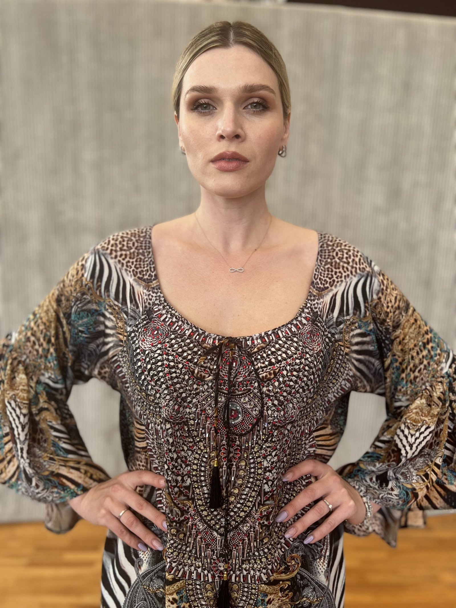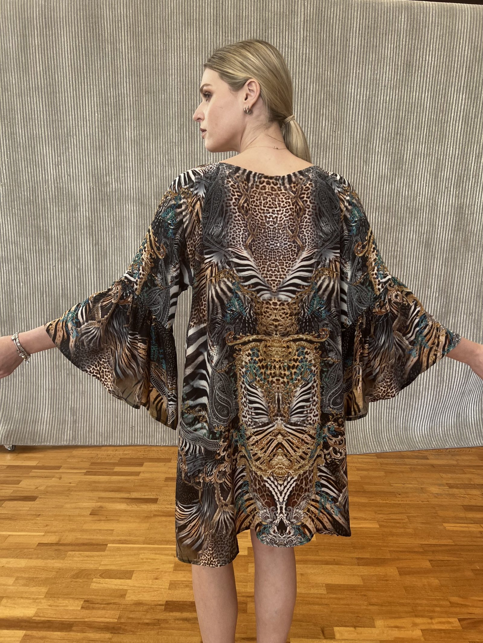 Ένα φόρεμα (100 % pure silk) με μανίκια που καταλήγουν σε βολάν στο τελείωμα τους. Το ντεκολτέ σε σχήμα λαιμόκοψης, είναι διακοσμημένο σε πέτρες Swarovski, και καταλήγει σε ένα δετό κορδόνι με καφέ μεταξωτές φούντες.