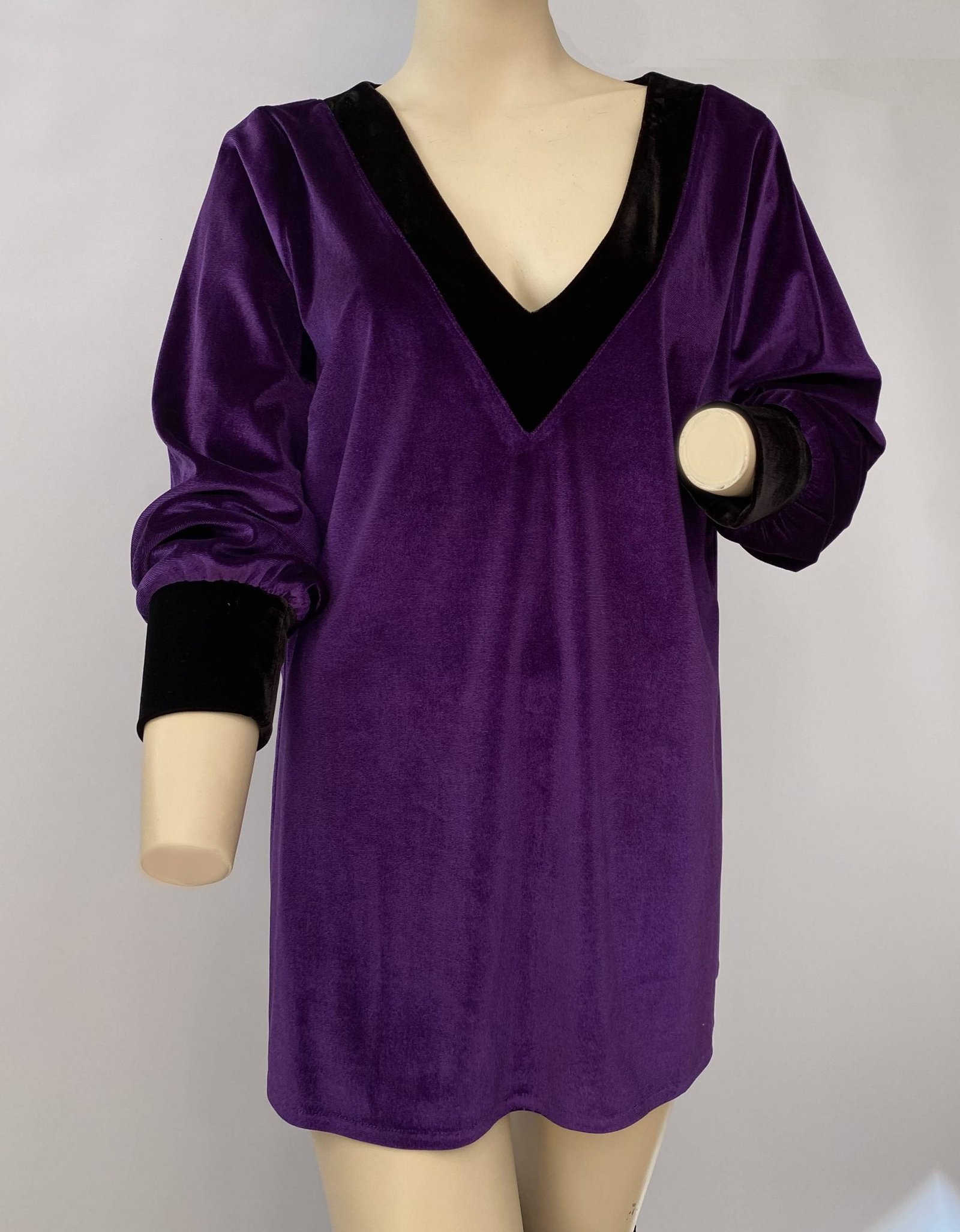 Βελούδινη μπλούζα σε χρώμα μοβ με ντεκολτέ σε σχήμα V από μαύρο βελούδο. Τα μανίκια καταλήγουν σε μανσέτες από μαύρο βελούδο.