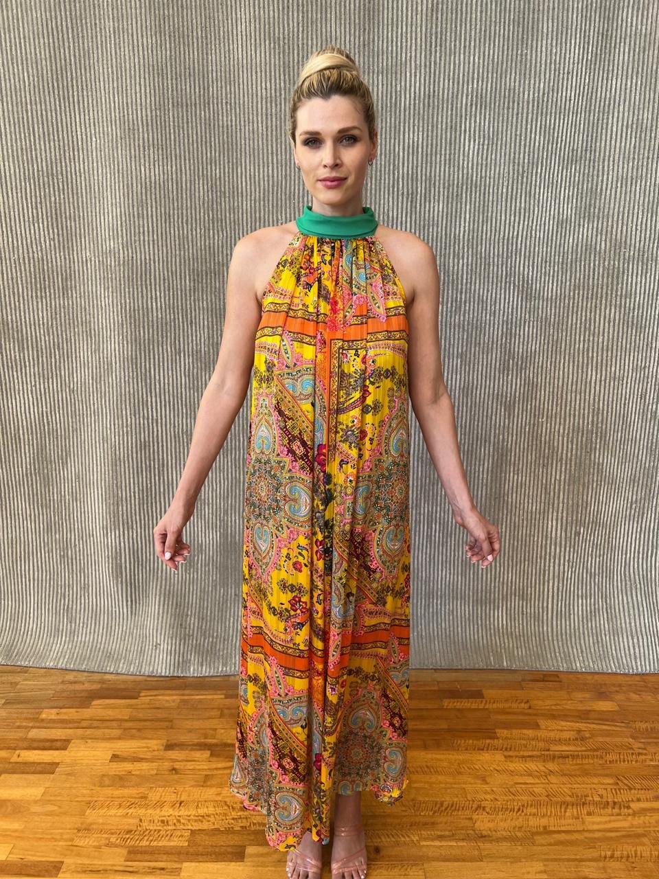Μακρύ μεταξωτό χειροποίητο φόρεμα με λεπτές χρυσές γραμμές λούρεξ, δικής μας παραγωγικής γραμμής, με το όνομα desmira. Χωρίς ώμους και με κλειστό λαιμό που στολίζεται με μακριά πράσινη τρέσα που είναι επενδυμένη από μετάξι και δένεται πίσω.