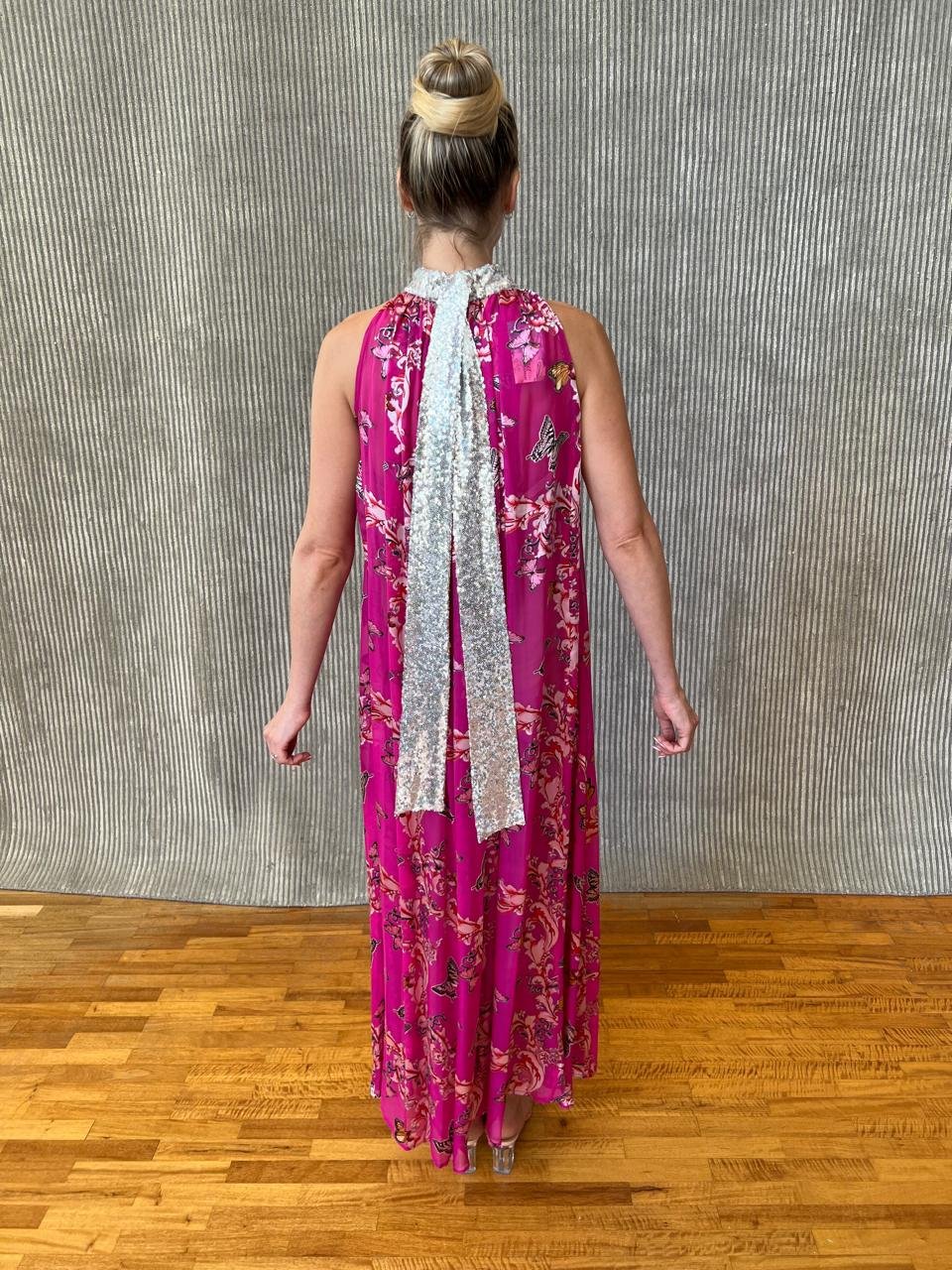 Το ροζ –  φούξια φόντο του φορέματος είναι διακοσμημένο με ανάγλυφες πεταλούδες σε ασημί χρώμα.