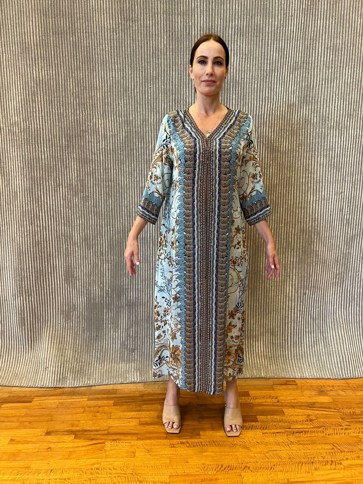 Μακρύ κιμονό σε μεταξωτό ύφασμα (100% pure silk). Το χρώμα του φόντου είναι τiρκουάζ με σχέδια από χρυσό κίτρινες μέδουσες. Όλο το print είναι τυπωμένο ειδικά για τη Desmira και αναγράφεται επάνω στο μεταξωτό ύφασμα. Η γραμμή του είναι ίσια με μανίκια και το ντεκολτέ είναι σε σχήμα V και είναι διακοσμημένο κατά μήκος στις δύο μεριές με χειροποίητη τρέσα η οποία είναι διακοσμημένη με πέτρες Swarovski. Μπορεί να φορεθεί από το απόγευμα μέχρι και το βράδυ με τα ανάλογα αξεσουάρ.