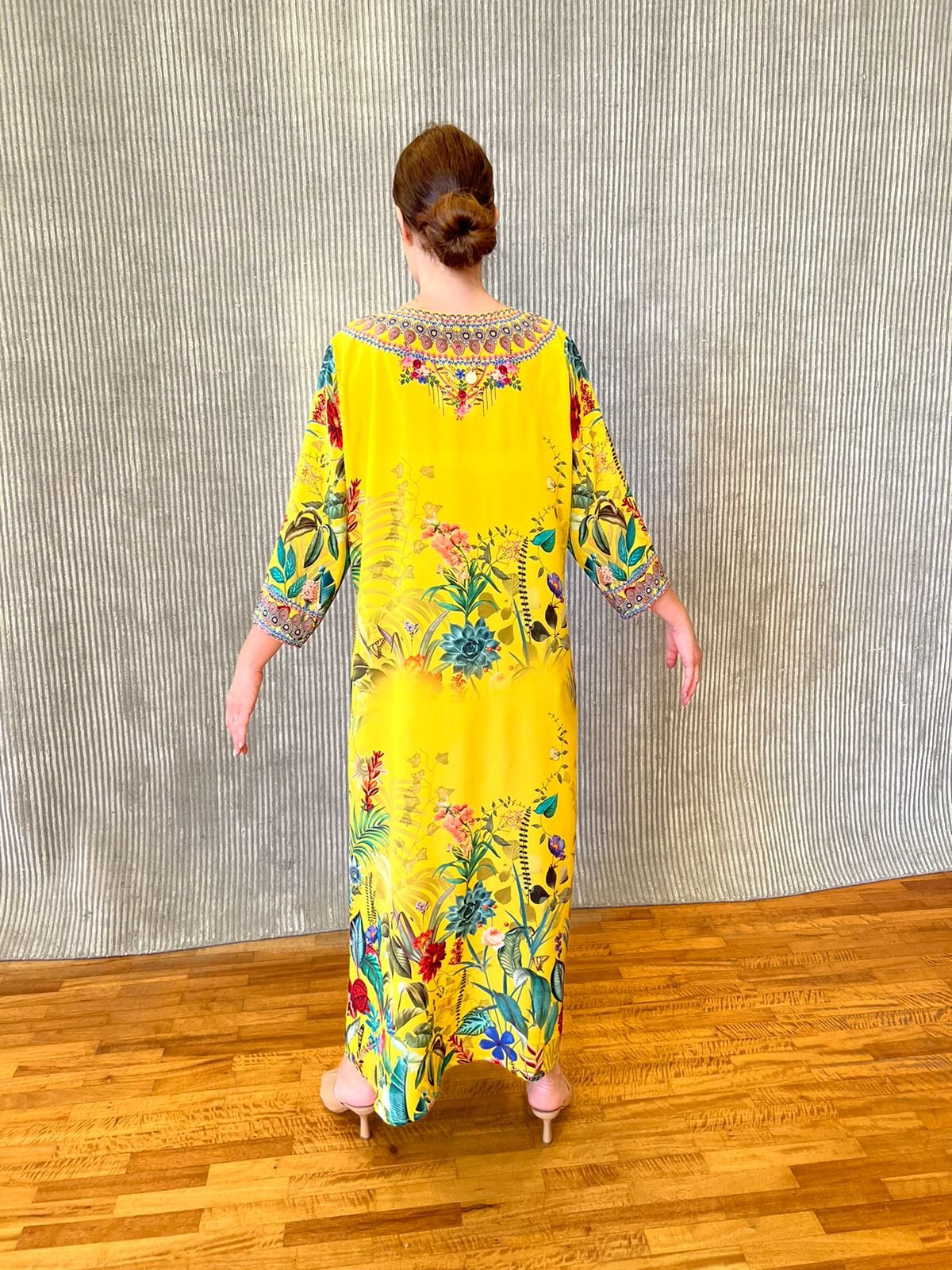 Μακρύ κιμονό σε μεταξωτό ύφασμα (100% pure silk). Σε χρώμα φόντου κίτρινο – καναρινή, πολύ σπάνιο διακοσμημένο με χειροποίητη τρέσα κατά μήκος στις δυο πλευρές και με πέτρες Swarovski. Όλο το print είναι τυπωμένο ειδικά για τη Desmira και αναγράφεται επάνω στο μεταξωτό ύφασμα. Η γραμμή του είναι ίσια με μανίκια. και το ντεκολτέ είναι σε σχήμα V.