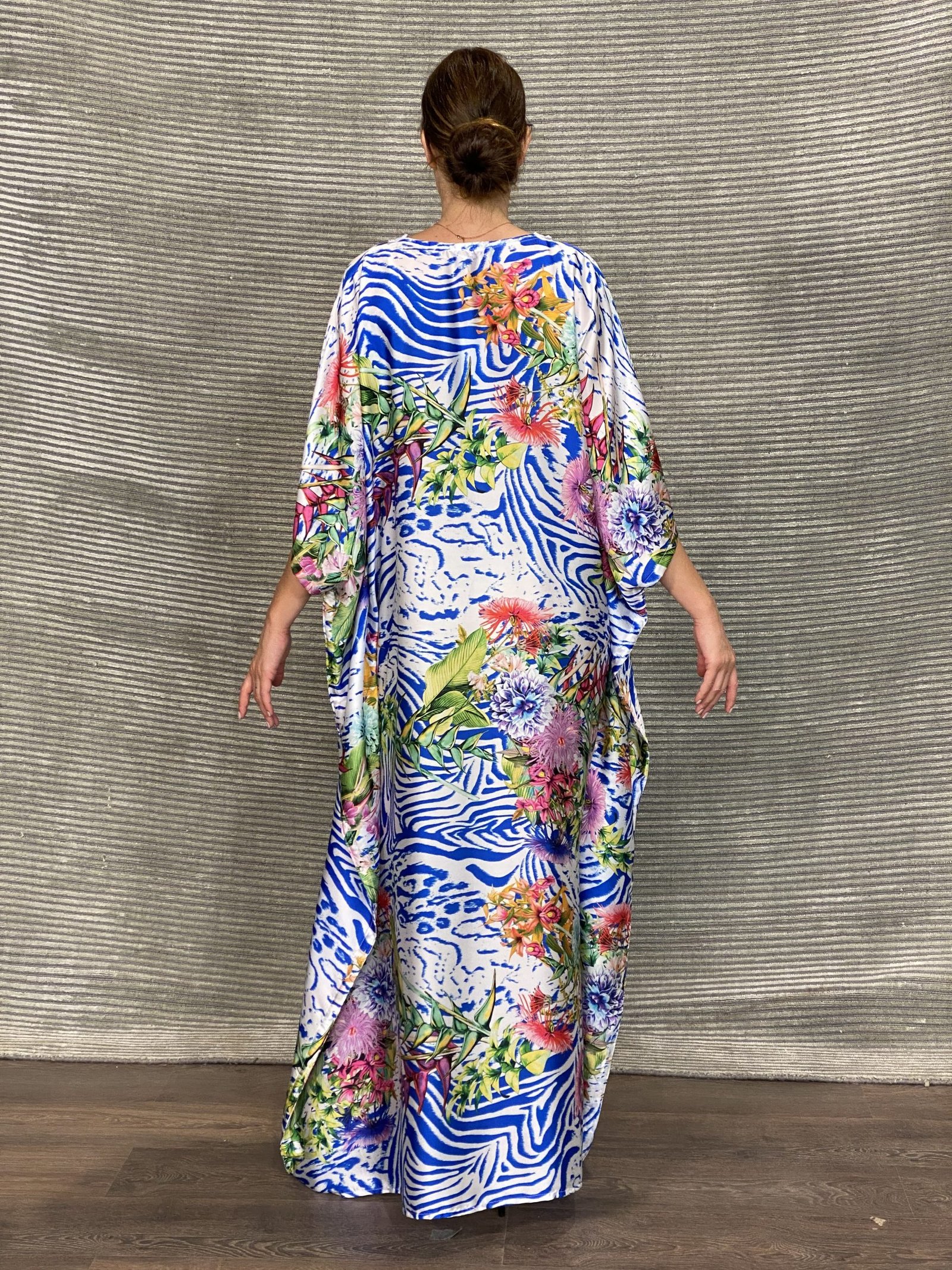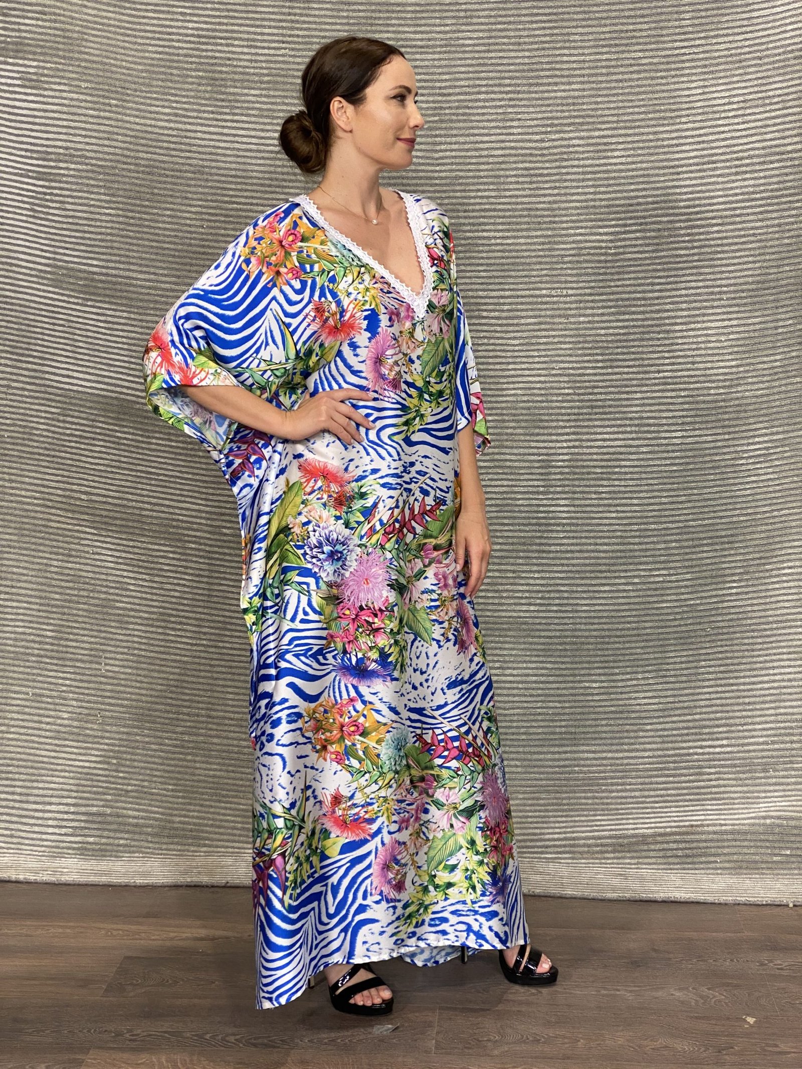 Χειροποίητο καφτάνι, δικής μας παραγωγικής γραμμής, crepe σατέν με το όνομα desmira. Λευκό χρώμα φόντου με σχέδια zebra με ιδιαίτερα φωτεινά χρώματα μπλε, μωβ και ροζ λουλούδια. Το ντεκολτέ είναι σε σxήμα V και διακοσμημένο με χειροποίητη λευκή δαντελένια τρέσα.