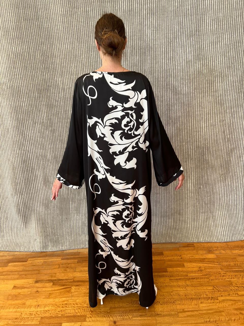 Καφτάνι –  φόρεμα μεταξωτό (100% pure silk) με κλειστή λαιμόκοψη και μανίκια που καταλήγουν σε καμπάνα. Σε μαύρο χρώμα φόντου με σχέδια λευκά, δίκης μας παραγωγής desmira.