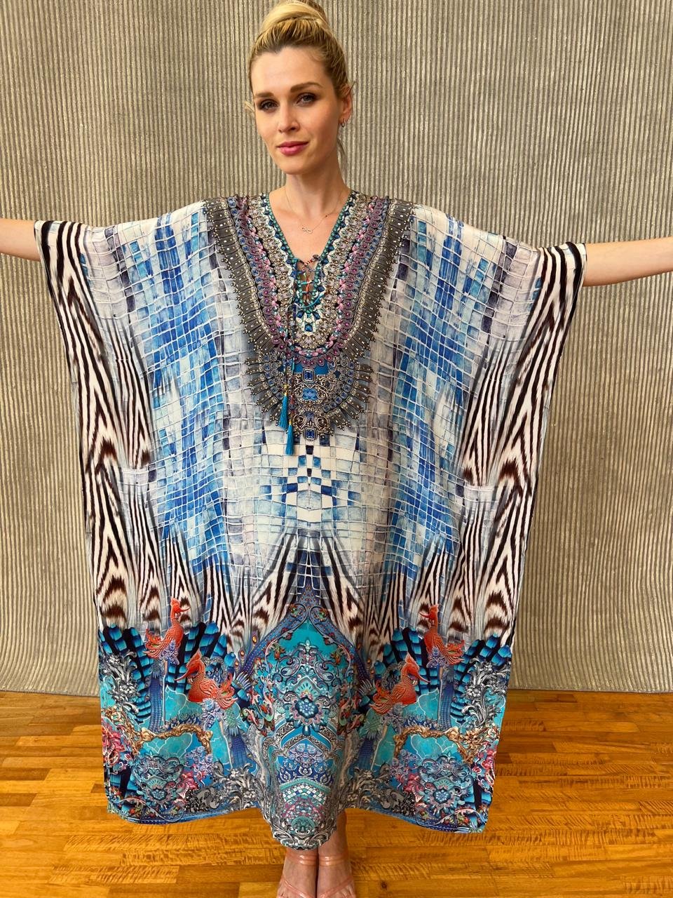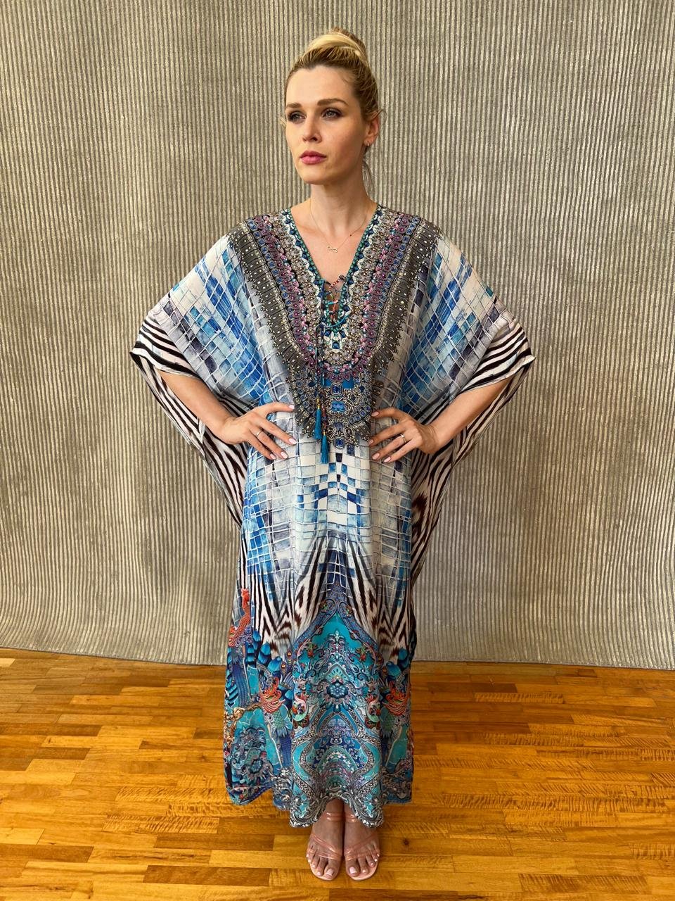 Χειροποίητο καφτάνι ινδικό (100% pure silk). Το χρώμα του φόντου είναι λευκό, γαλάζιο και μπλε. Με γεωμετρικού χαρακτήρα σχέδια στις ίδιες αποχρώσεις και σε χρώματα κοραλί και πορτοκαλί πουλιά – φασιανοί. Το ντεκολτέ έχει σχήμα V το οποίο στολίζεται με πέτρες Swarovski σε αποχρώσειςμπλε, γκρί και χρυσαφί και καταλήγει σε ένα δετό κορδόνι με μπλε μεταξωτές φούντες.