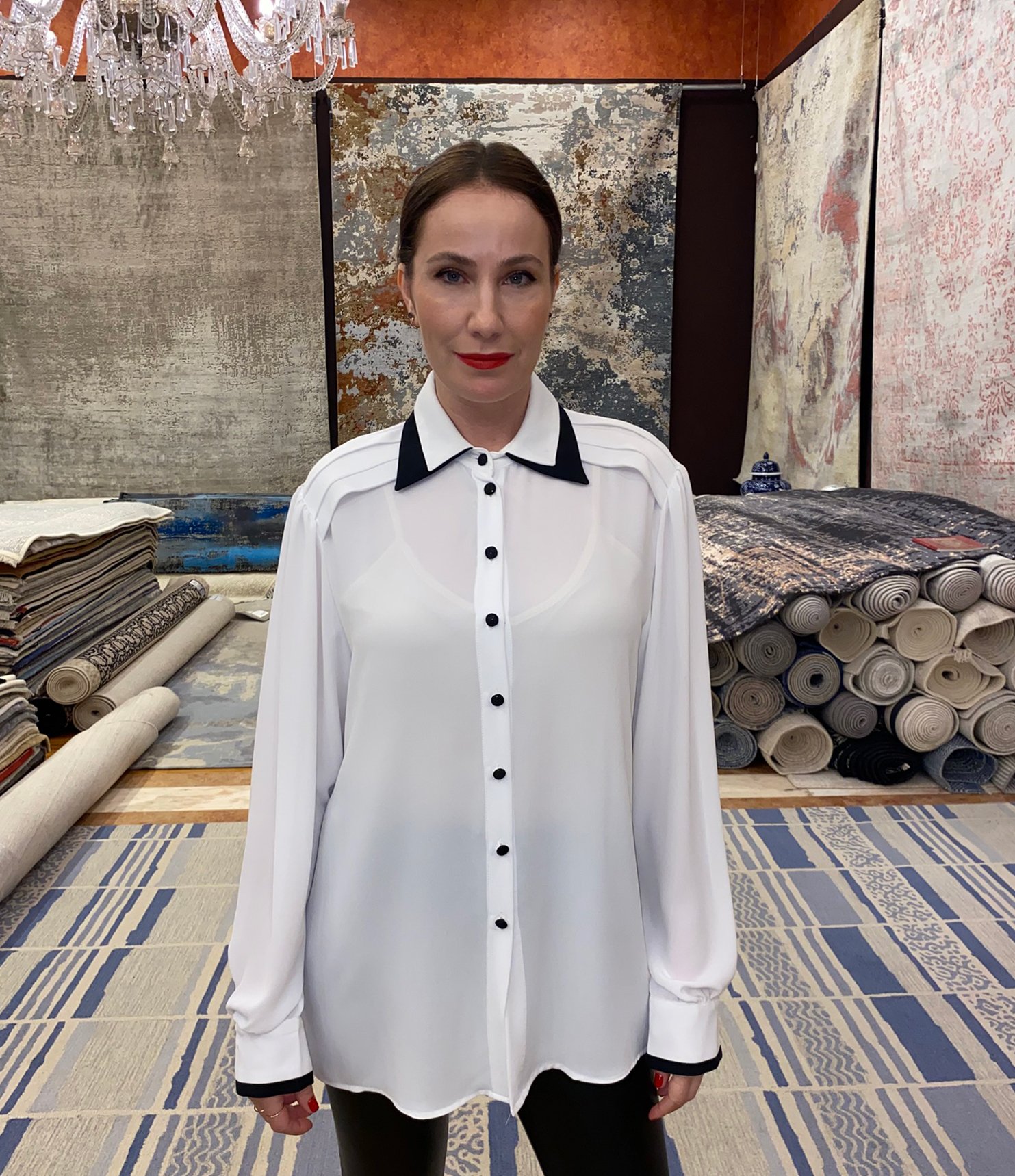 Χειροποίητο αέρινο πουκάμισο από λευκή μεταξωτή ζορζέτα με μαύρες λεπτομέρειες.