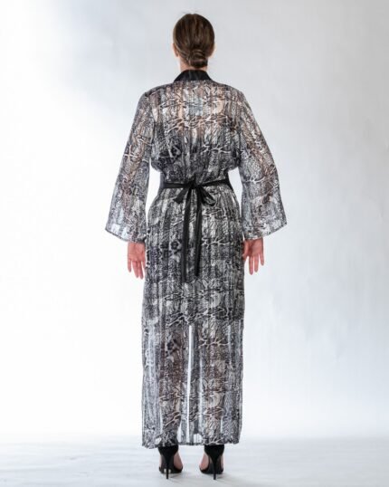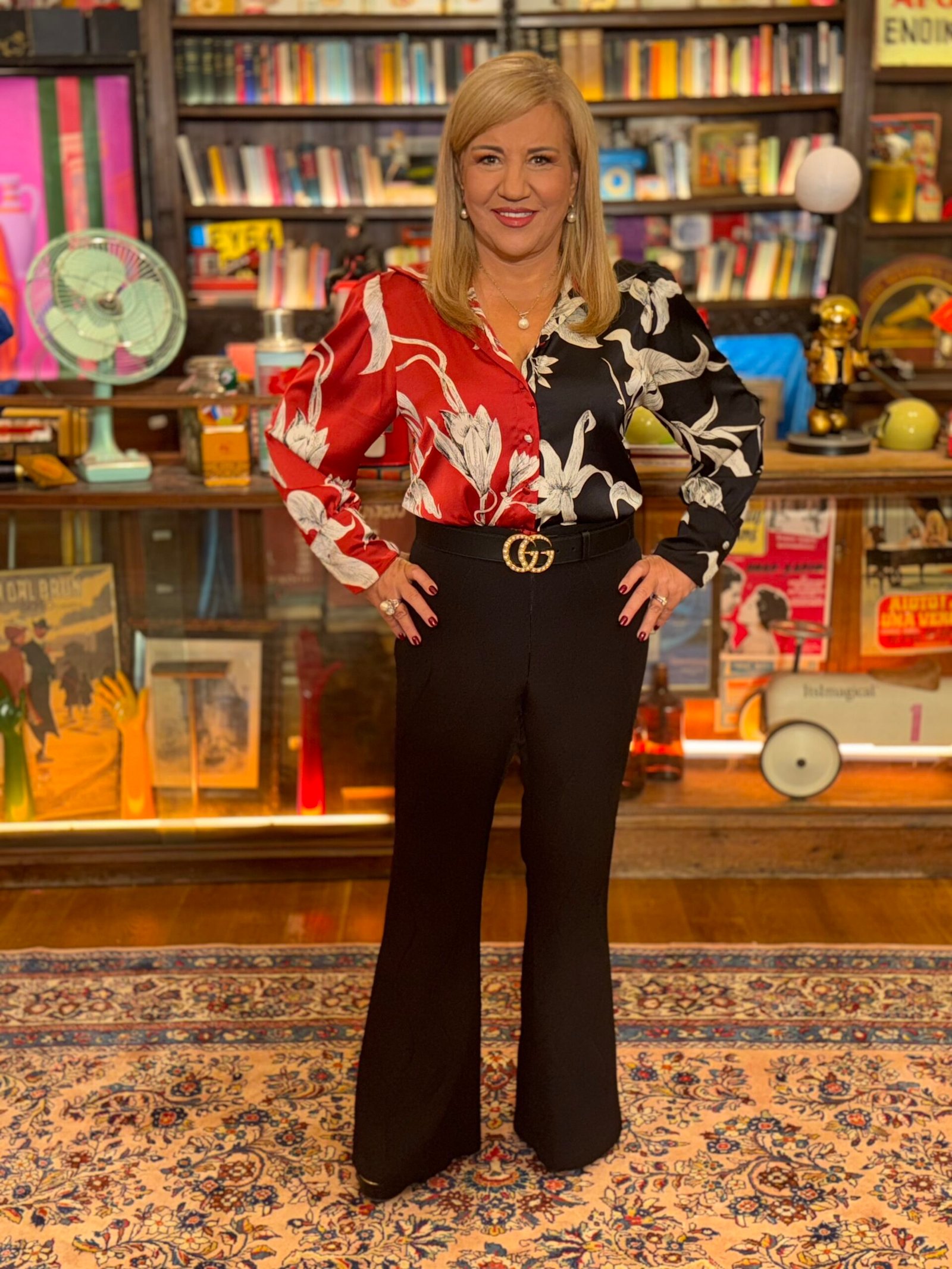 Σε χρώμα φόντου μαύρο και κόκκινο με γιακά και μανσέτα με ντυτό κουμπί.