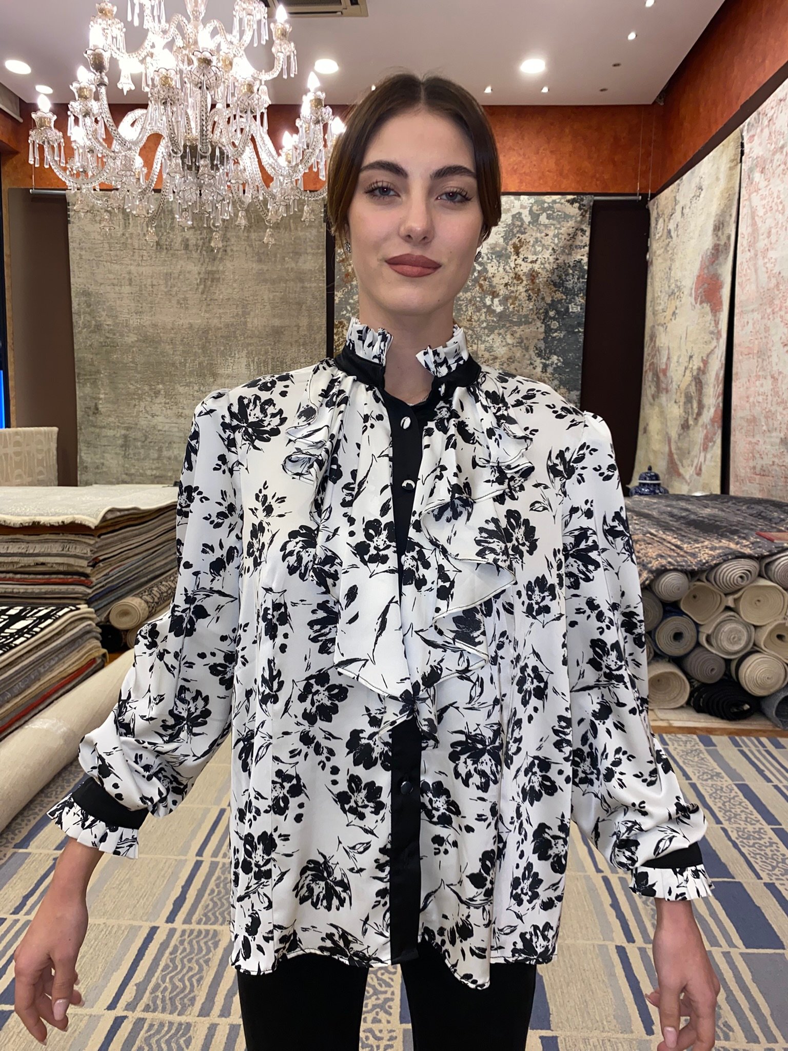 Μπροστά έχει βολάν από το αντίστοιχο ύφασμα και στο αντίστοιχο χρώμα. Κλείνει με κουμπιά μπροστά και μακριά μανίκια που κλείνουν με κουμπί ντυτό στο ίδιο ύφασμα.