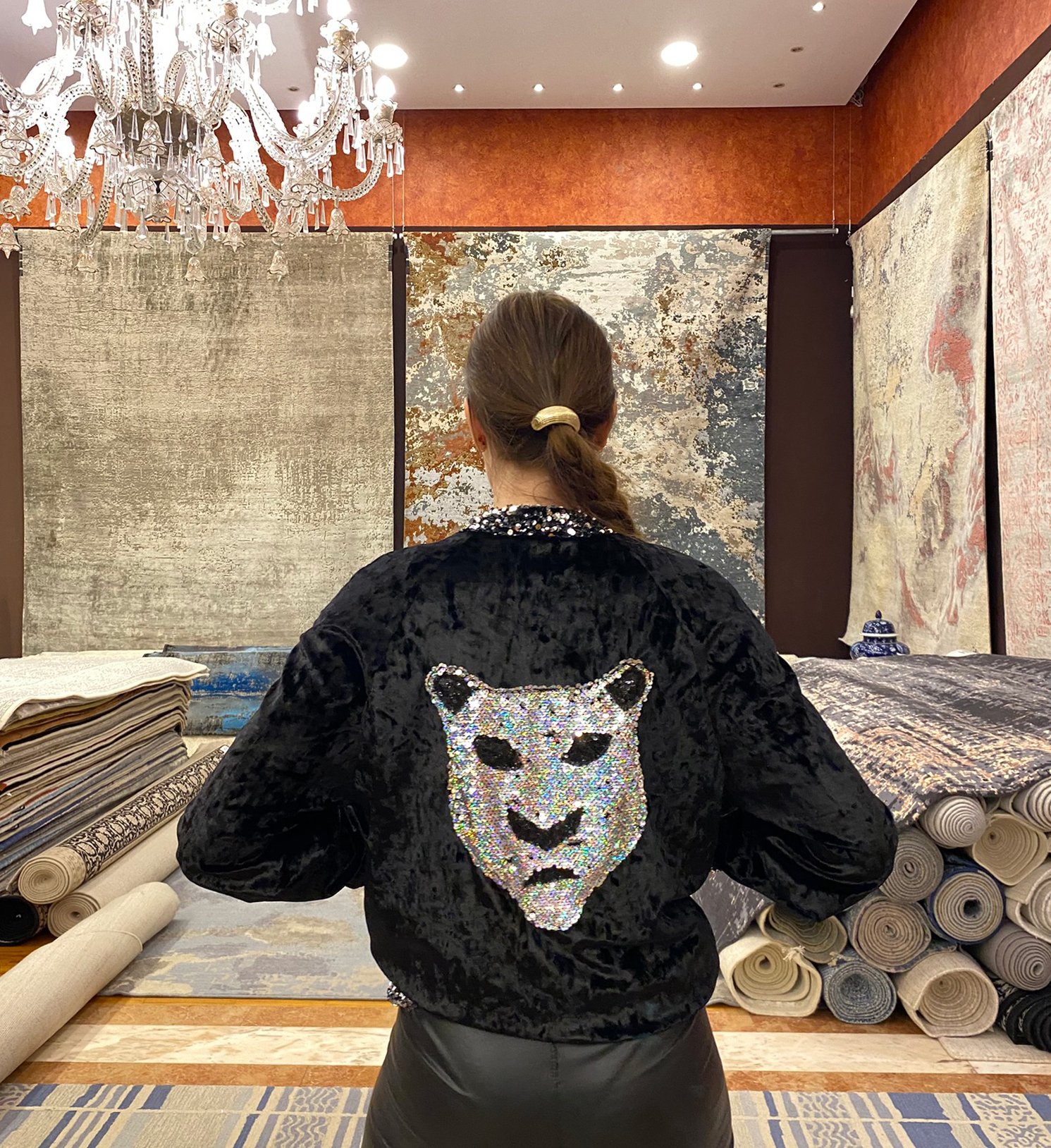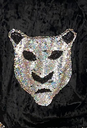 Βελούδινο μπουφάν σε μαύρο χρώμα με patch στη πίσω πλευρά από ασημένια παγιέτα με σχέδιο κεφάλι τίγρης.