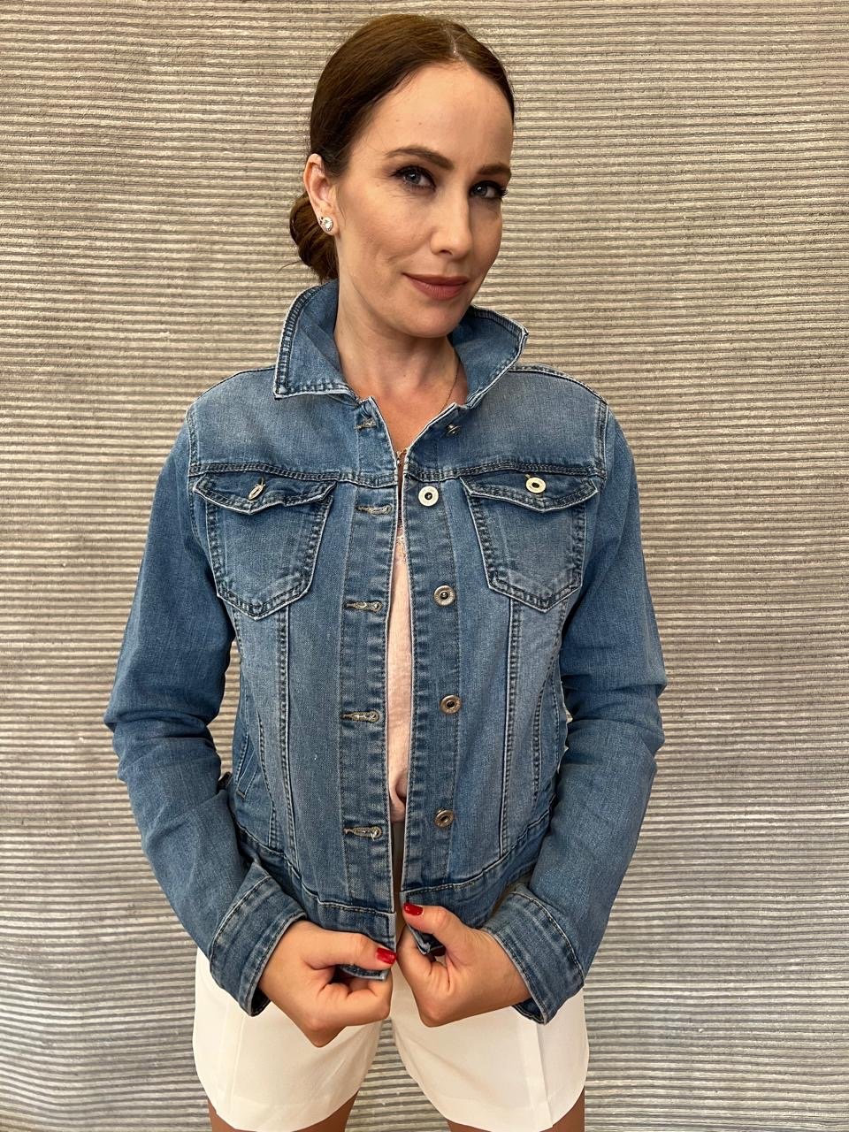 Tζιν τζάκετ σε ανοιχτό μπλε χρώμα με κλασσικό κόψιμο σε στενή γραμμή από τη συλλογή Desmira. Στην πίσω πλευρά είναι διακοσμημένο με ένα εντυπωσιακό patch το μάτι της ζωής με λευκό και μπλε χρώμα παγιέτας.