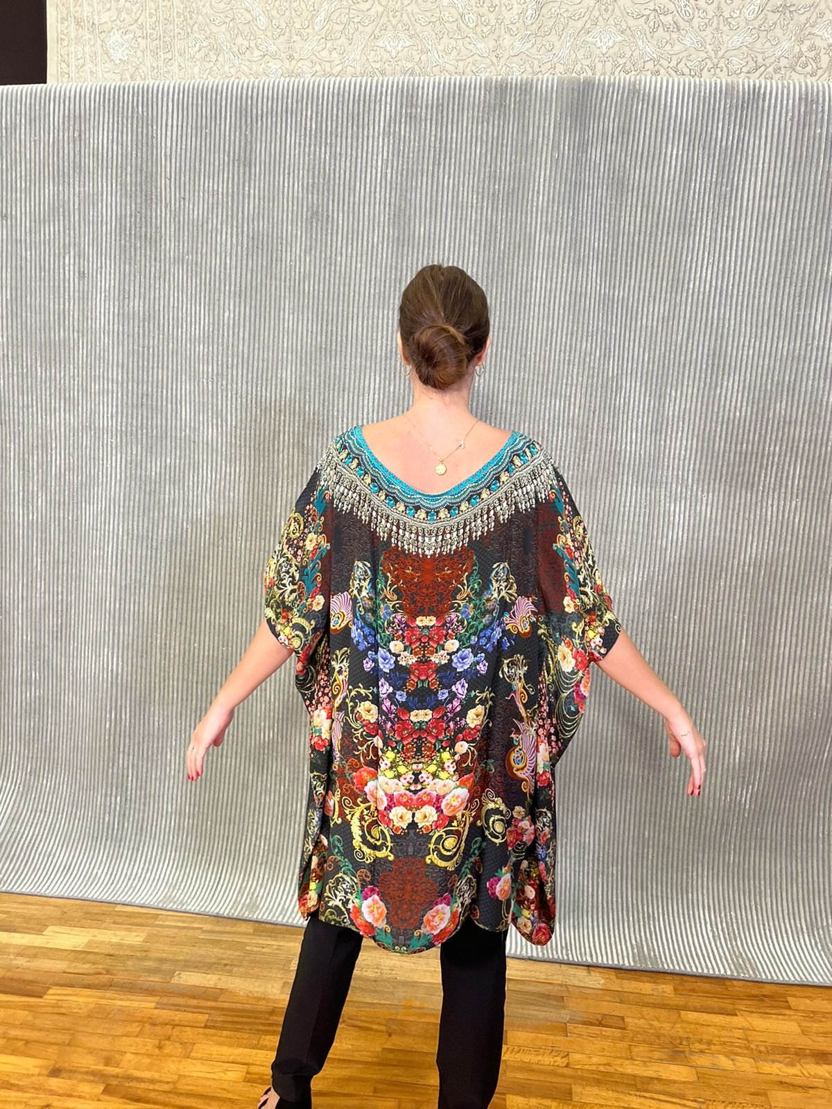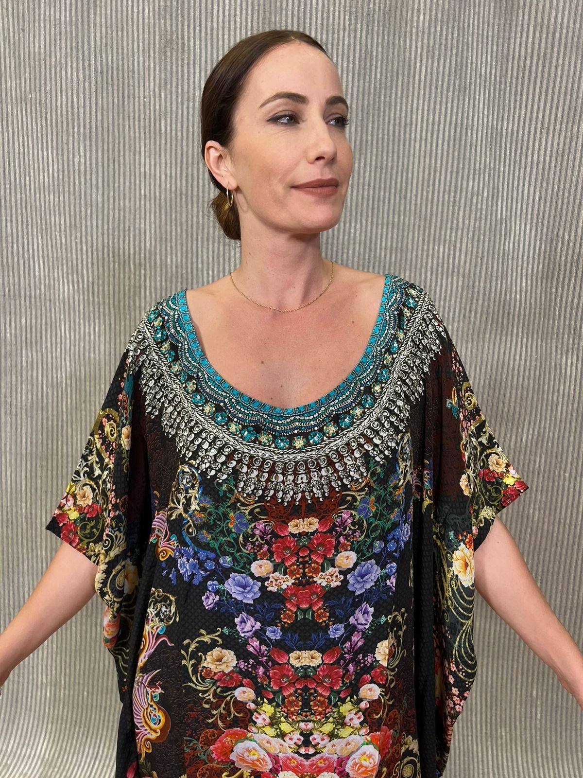 Μπλούζα από μετάξι (100% pure silk) με κοντά μανίκια. Σε μαύρο φόντο στολισμένο με πολύχρωμα τριαντάφυλλα και γιρλάντες λουλουδιών σε αποχρώσεις κοραλοκόκκινο & χρυσοκίτρινο. Με λαιμόκοψη και στολισμένη με πέτρες Swarovski.