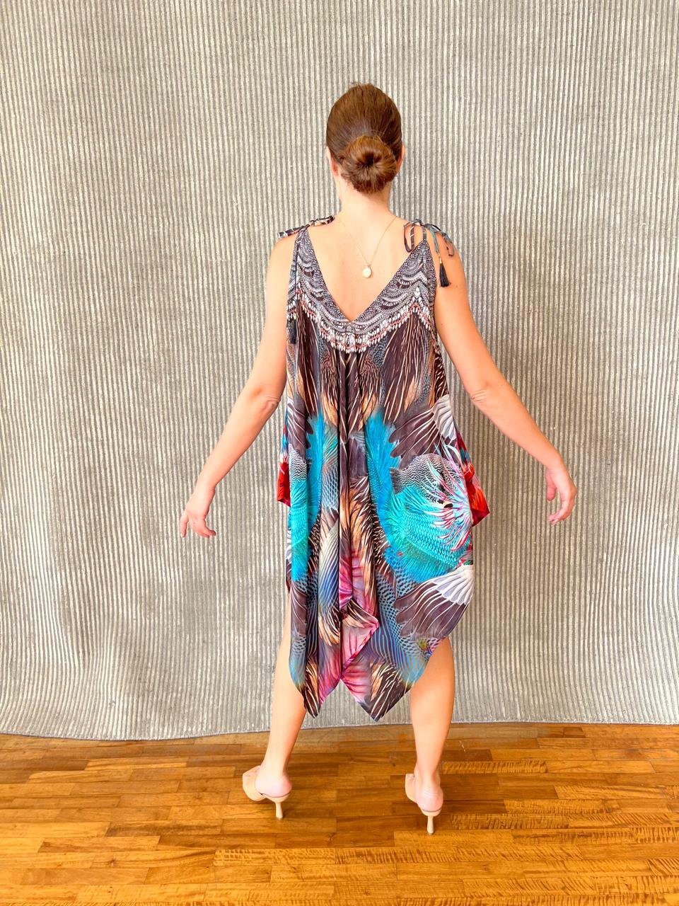 Μεταξωτό φόρεμα με τιράντες από ύφασμα (100% pure silk) που καταλήγει με ασύμμετρες μύτες δεξιά και αριστερά. Το ντεκολτέ μπροστά και στην πίσω πλευρά σχηματίζει το V. Το μπροστινό ντεκολτέ είναι στολισμένο με πέτρες Swarovski σε χρώμα ασημί.