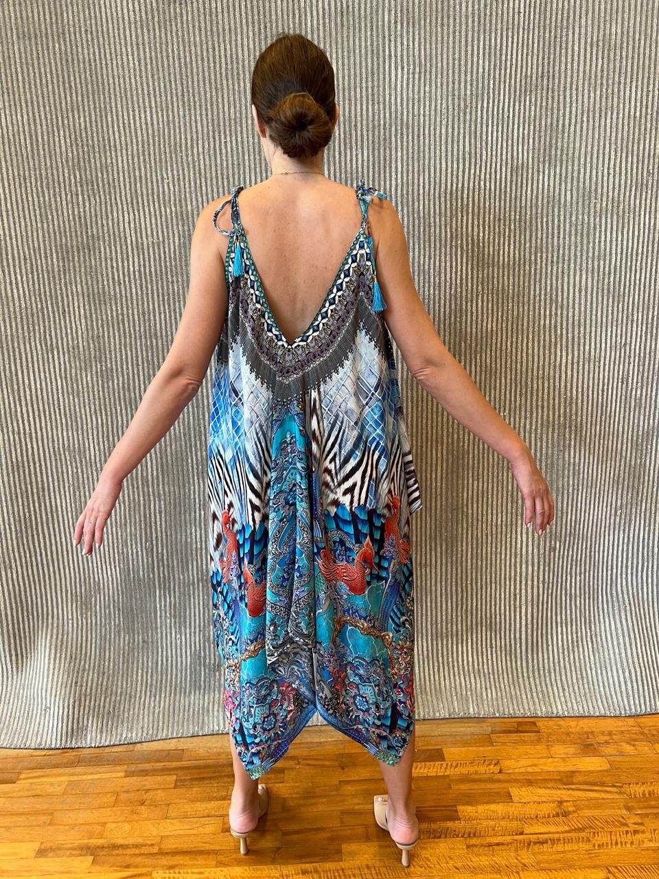 Μεταξωτό φόρεμα με τιράντες από ύφασμα (100% pure silk) που καταλήγει με ασύμμετρες μύτες δεξιά και αριστερά. Το ντεκολτέ μπροστά και στην πίσω πλευρά σχηματίζει το V. Το μπροστινό ντεκολτέ είναι στολισμένο με πέτρες Swarovski σε χρώματα μπλε, τιρκουάζ και ασημί.