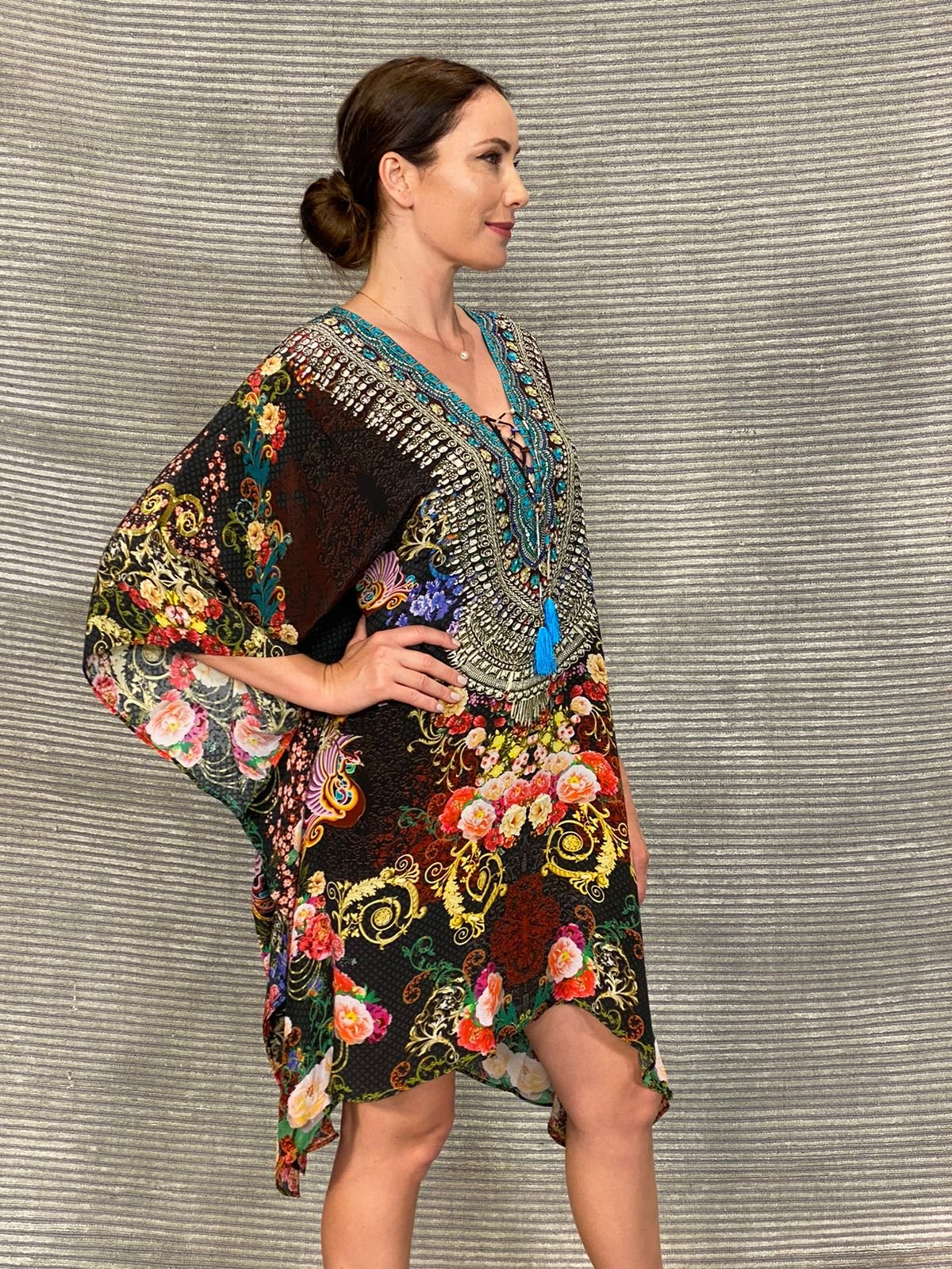 Φόρεμα – Καφτάνι κοντό με ντεκολτέ σε σχήμα λαιμόκοψης που καταλήγει σε ένα δετό κορδόνι με μπλε μεταξωτές φούντες και είναι διακοσμημένο με πέτρες Swarovski. Λαδοκαφέ αποχρώσεις με κιτρίνα και ροζ λουλούδια σε καφέ φόντο.